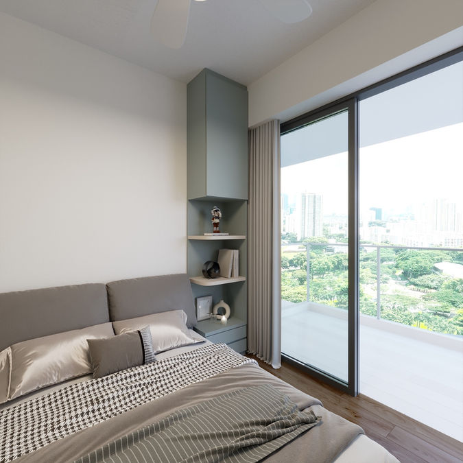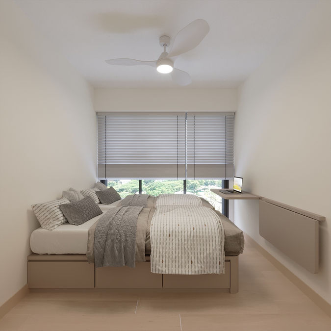 3D rendering of a 3-bedroom Executive Condominium @ The Florence Residences. This condominium embraces a warm and homely atmosphere, tailored for a family with teenagers. The living hall is bathed in soft, warm lighting, casting a comforting glow over gatherings and quiet evenings. Complemented by soothing grey aesthetics, the space exudes modern elegance while remaining inviting and approachable.