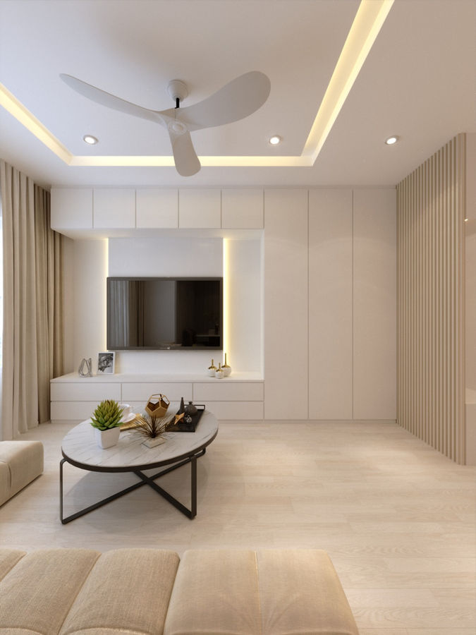 3D rendering of a 4-room HDB located in Yishun. This flat makeover exudes elegance with neutral aesthetics, ensuring a timeless appeal that never goes out of style. The seamless TV console feature wall not only adds a touch of sophistication but also offers amples storage, extending into the foyer area for enhance functionality. In the kitchen, full-height top and bottom cabinets create a clutter-free environment, allowing for a seamless look while discreetly storing away any mess.